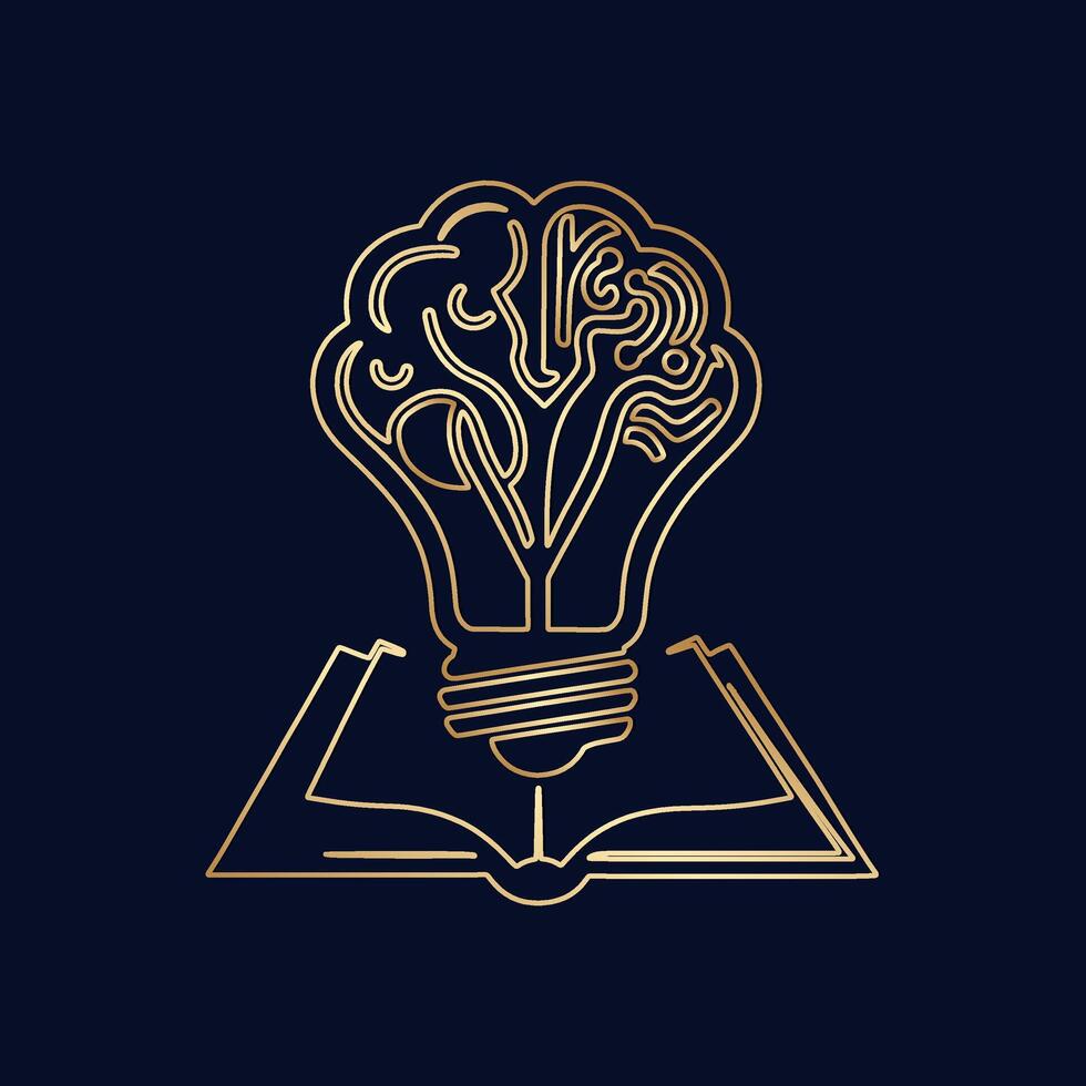 Golden outline of a brain inside a lightbulb emerging from an open book Pro Vector