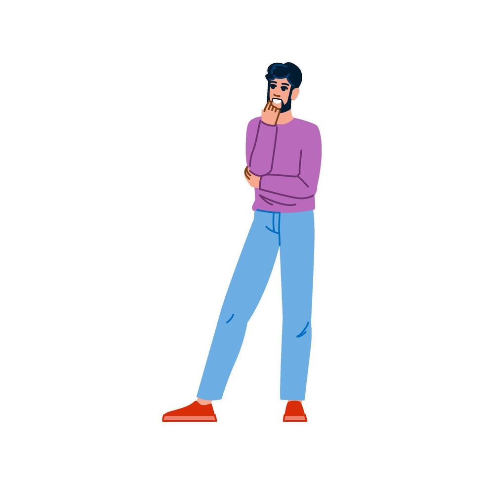 Pensive man thinking and touching his beard, finding solution for problem Pro Vector