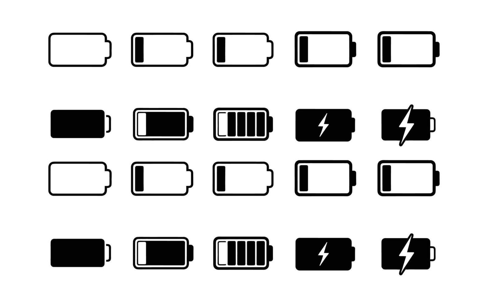 Battery icons showing full, charging, and low power levels for technology and energy concepts Pro Vector