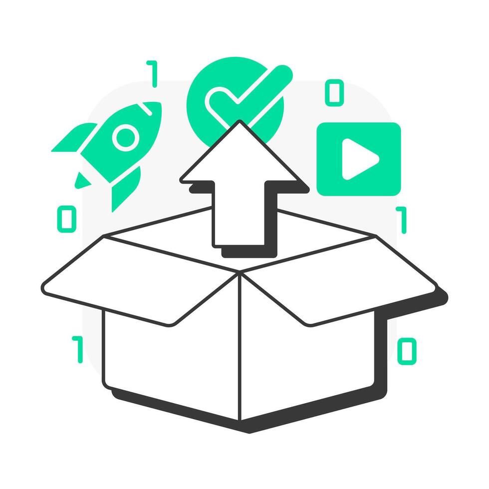 Implementation flat outline concept icon. Efficiency rocket, productivity. Development, innovation. Open box. Modern line illustration with green glyphs. Conceptual visual. Easy to edit Pro Vector