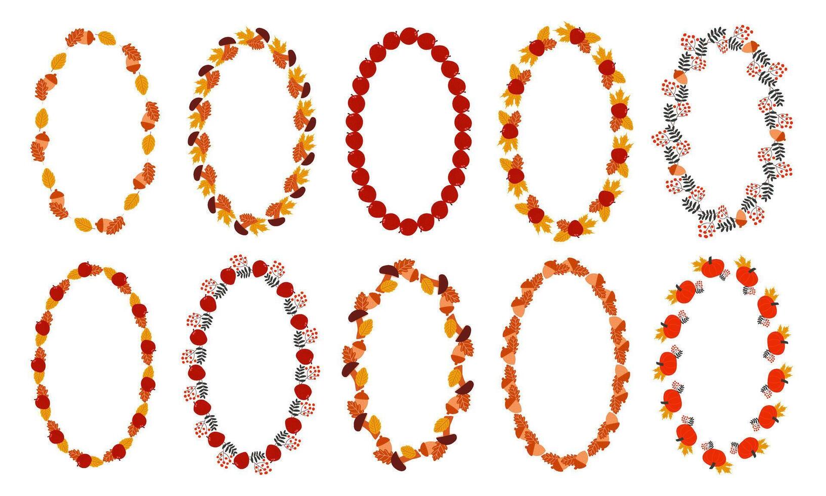 Autumn oval frame set. Oak and maple leaves, apples and acorn with rowan berry branch. Wreathes on transparent background. Pro Vector