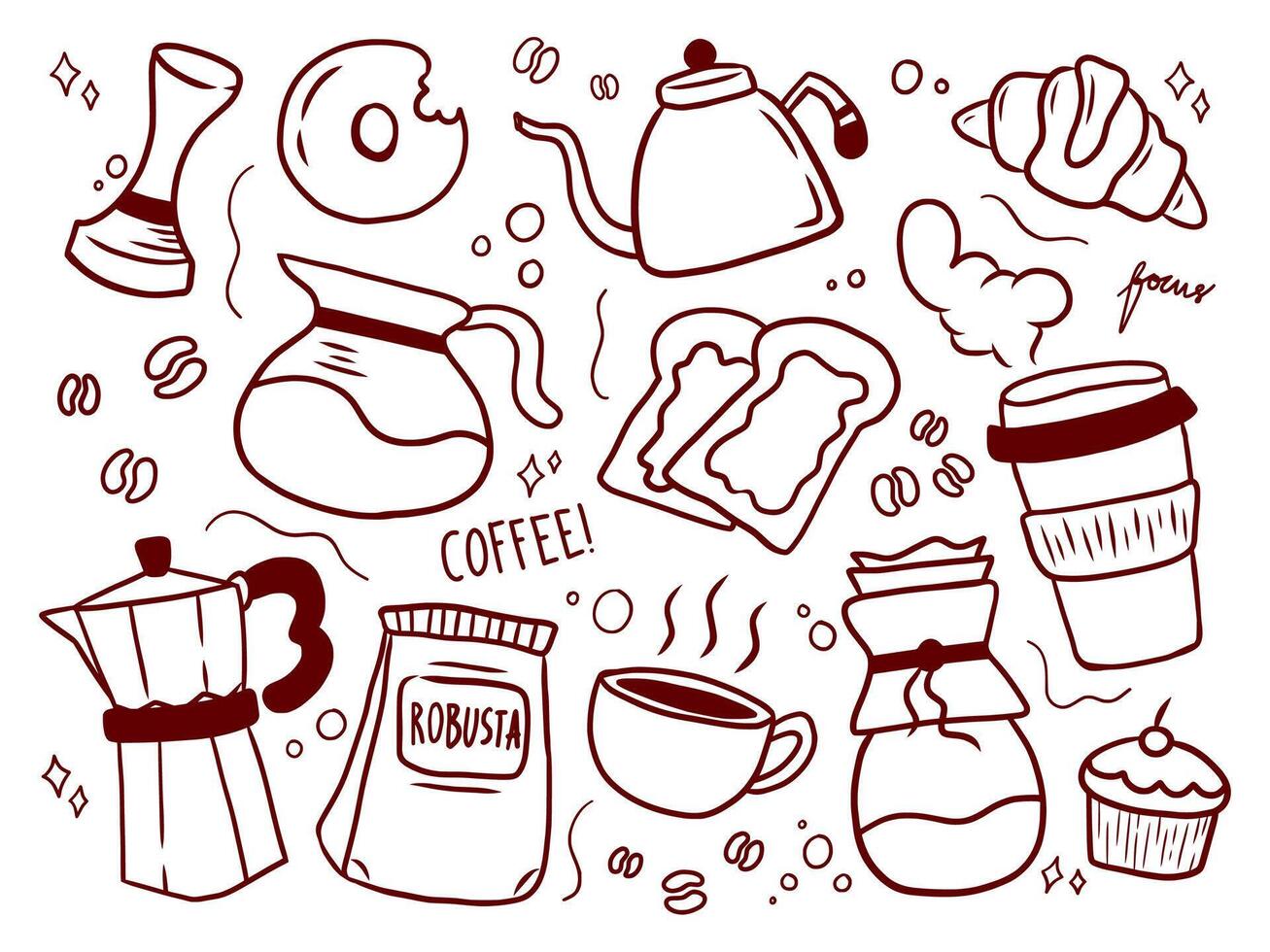 Coffee and pastry seamless pattern with a hand drawn doodle style. background illustration of cafe elements like cups and croissants for menu or fabric design. vector