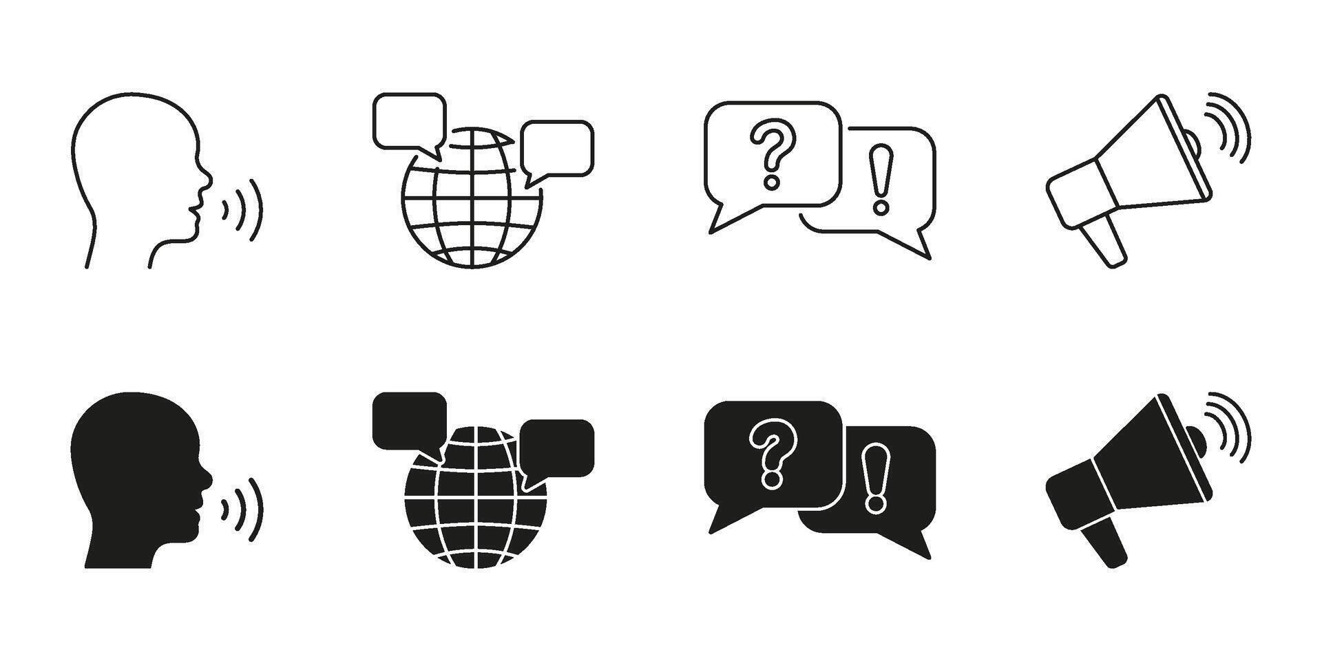 Communication And Speech Line And Solid Icon Set. Global Interaction, Inquiry, And Announcement Symbol Collection. Voice, Messaging, And Broadcasting Elements. Isolated Illustration Pro Vector