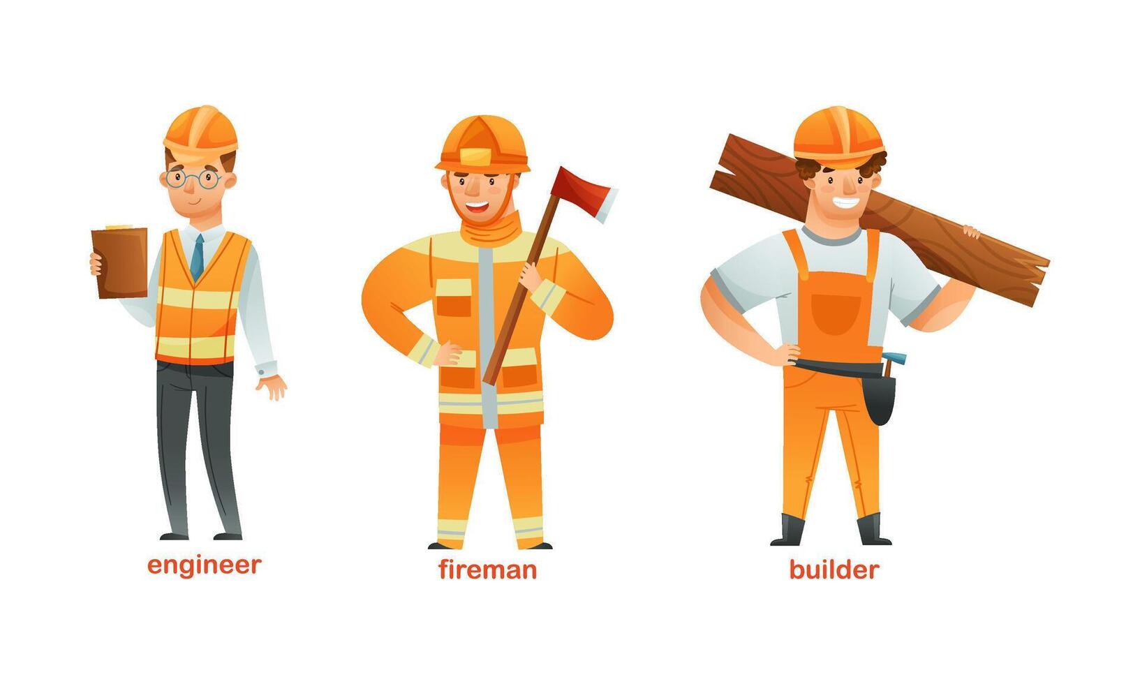 Man Character of Various Professions with Engineer, Fireman and Builder in Uniform Set Pro Vector