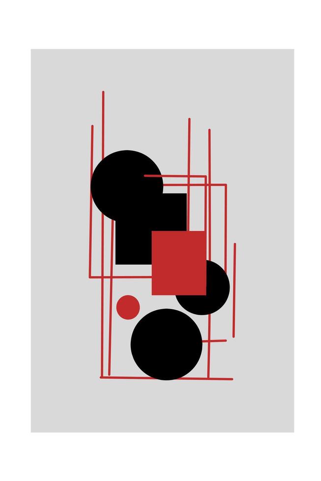 Abstract design with black circles, red squares, and intersecting red lines on a gray background. A bold and modern composition with geometric balance and contrast. vector