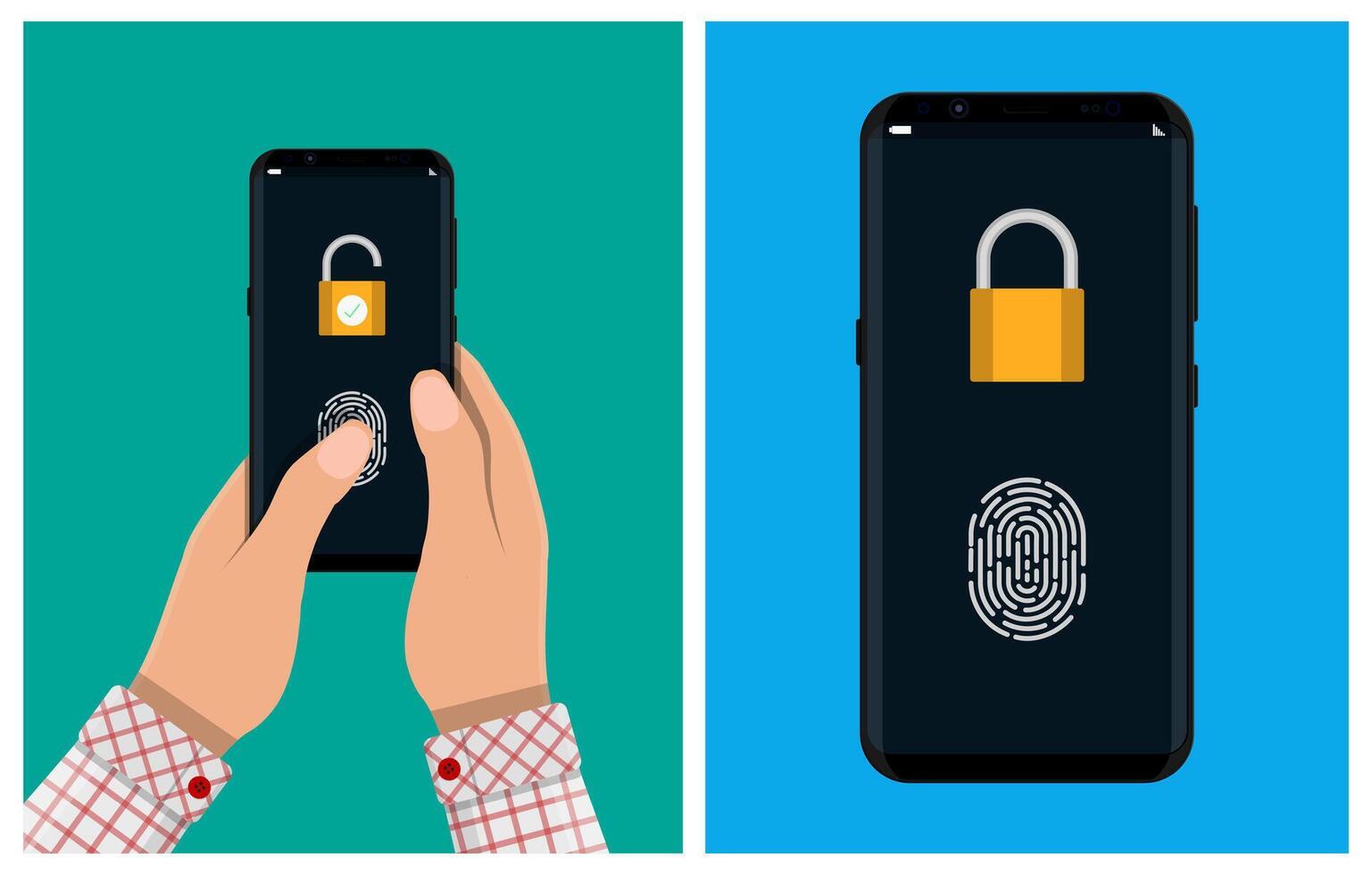 Man holding smartphone unlocking with fingerprint Pro Vector