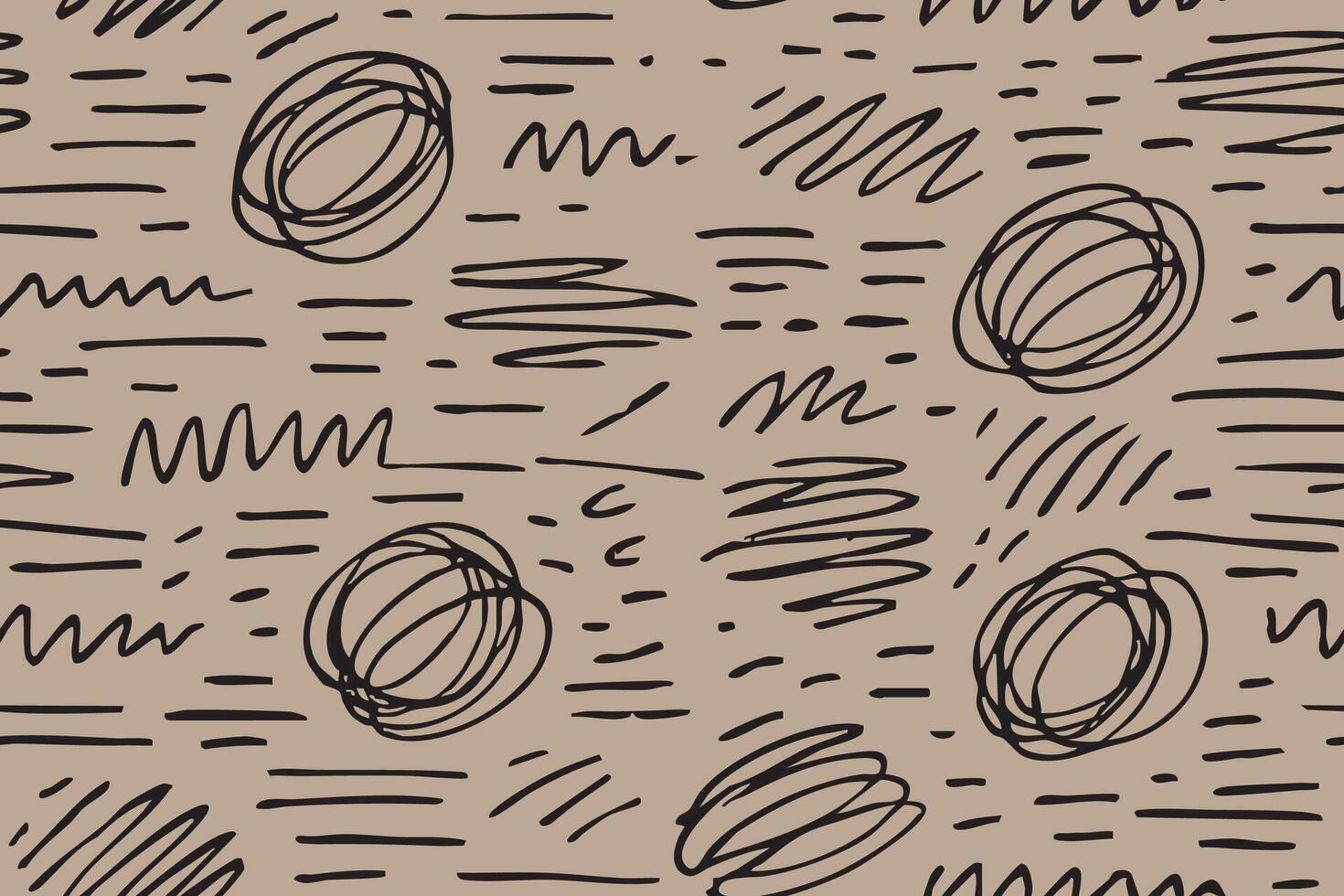 Seamless Black scribble line and circle pattern on beige background Pro Vector