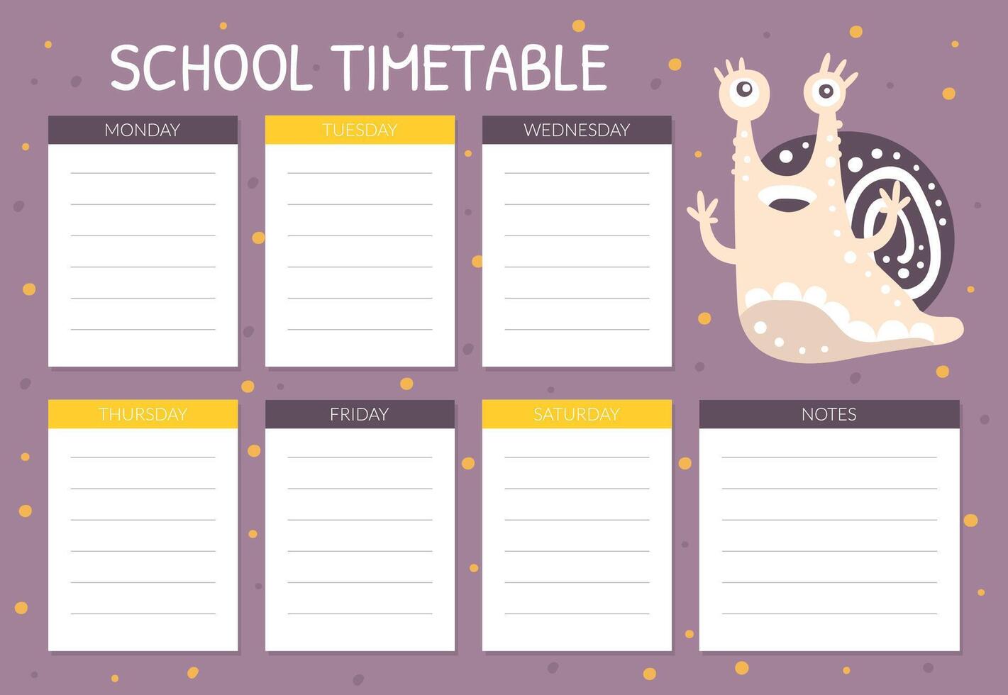 School Timetable with Cute Snail Character as Gastropod with Coiled Shell Template Pro Vector