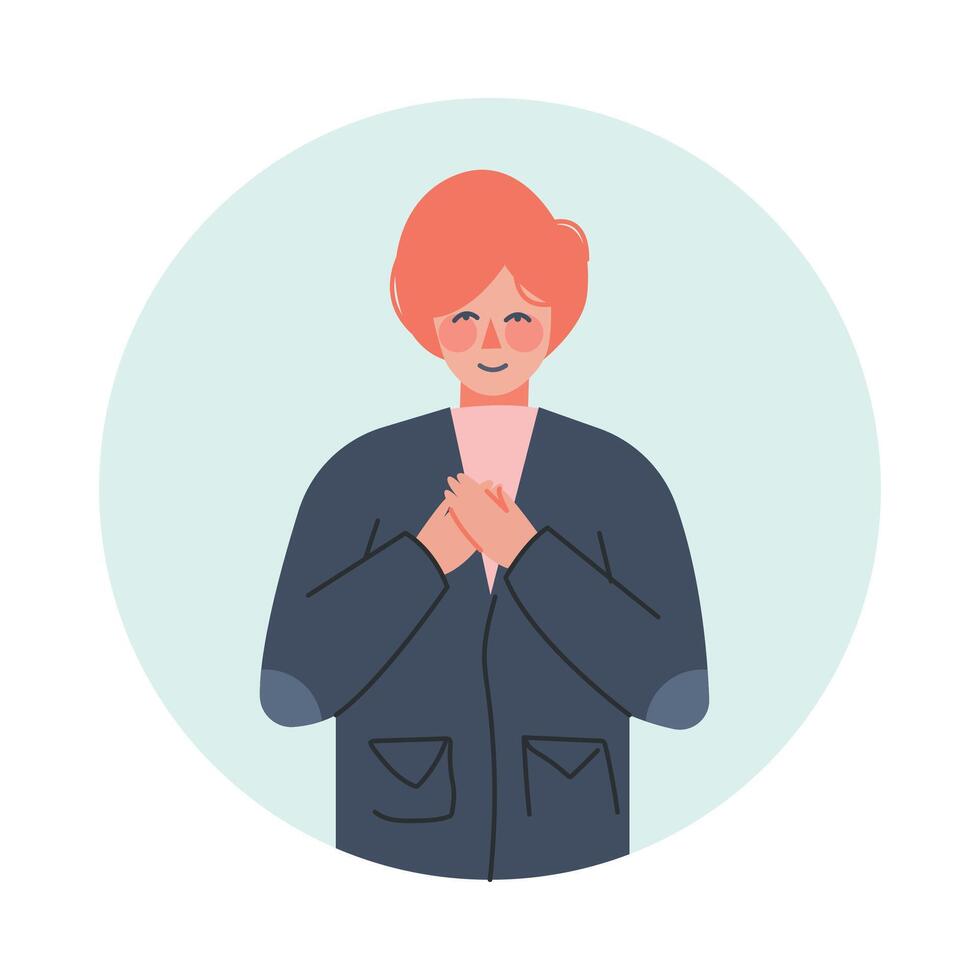 Smiling Man with Hands on Heart Making Positive Hand Gesture in Circular Frame Illustration Pro Vector
