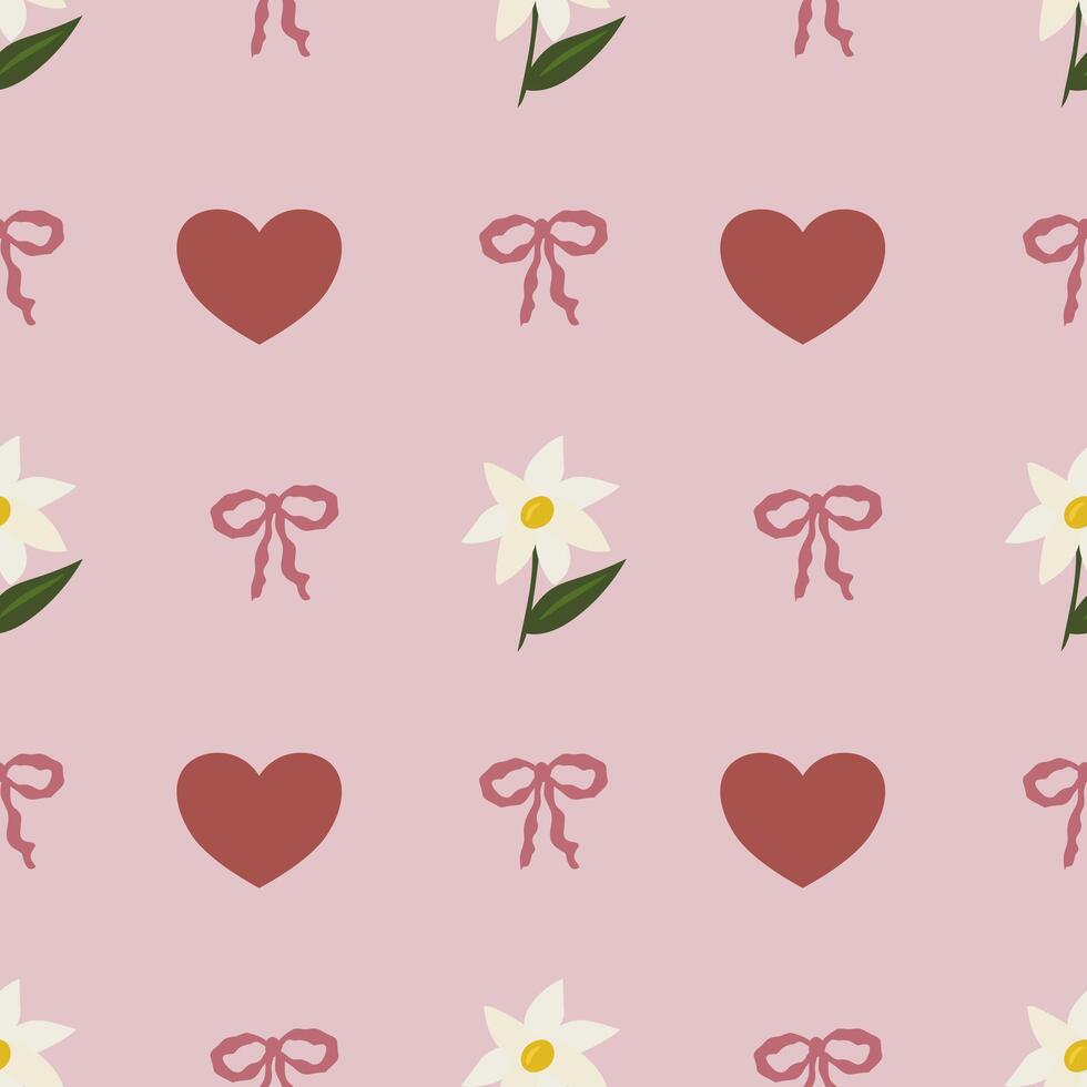 Seamless pattern featuring a delicate arrangement of stylized hearts, flowers, and bows on a soft pink background, creating a charming and romantic design ideal for various applications. Pro Vector