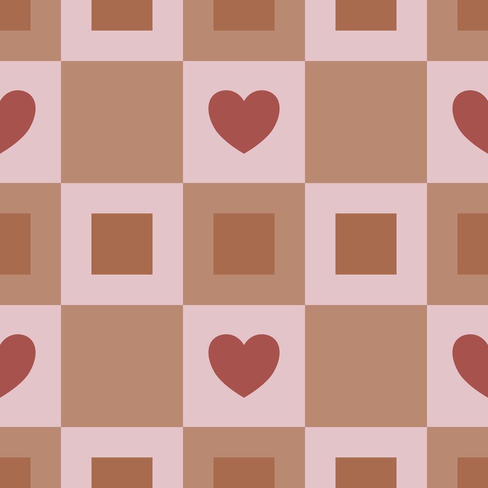 Seamless pattern with terracotta and blush pink squares and hearts, creating a minimalist geometric design ideal for textile prints or romantic backgrounds. Pro Vector