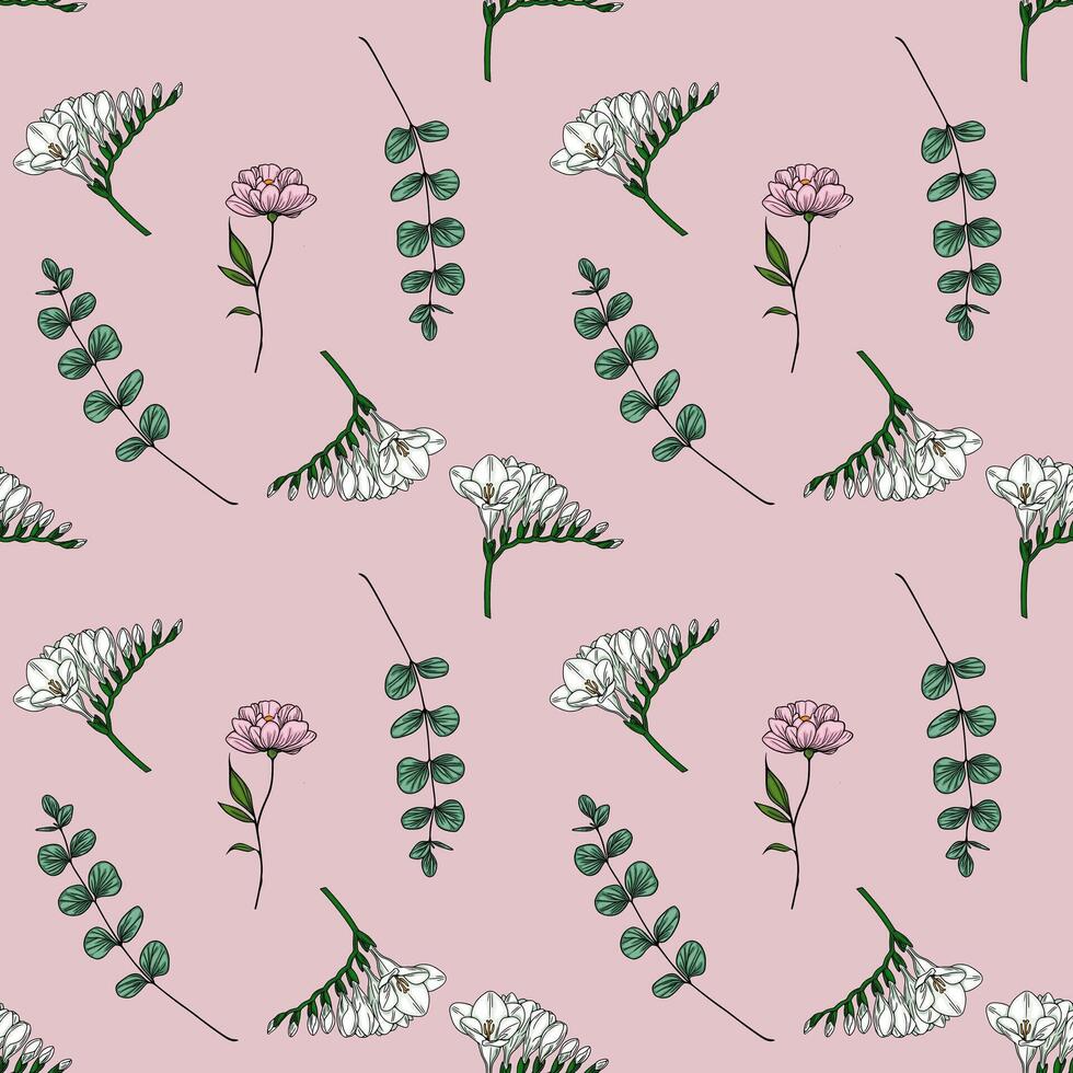 Elegant seamless pattern featuring delicate freesia flowers, eucalyptus branches, and subtle pink blossoms, creating a soft and romantic design ideal for various applications. Pro Vector