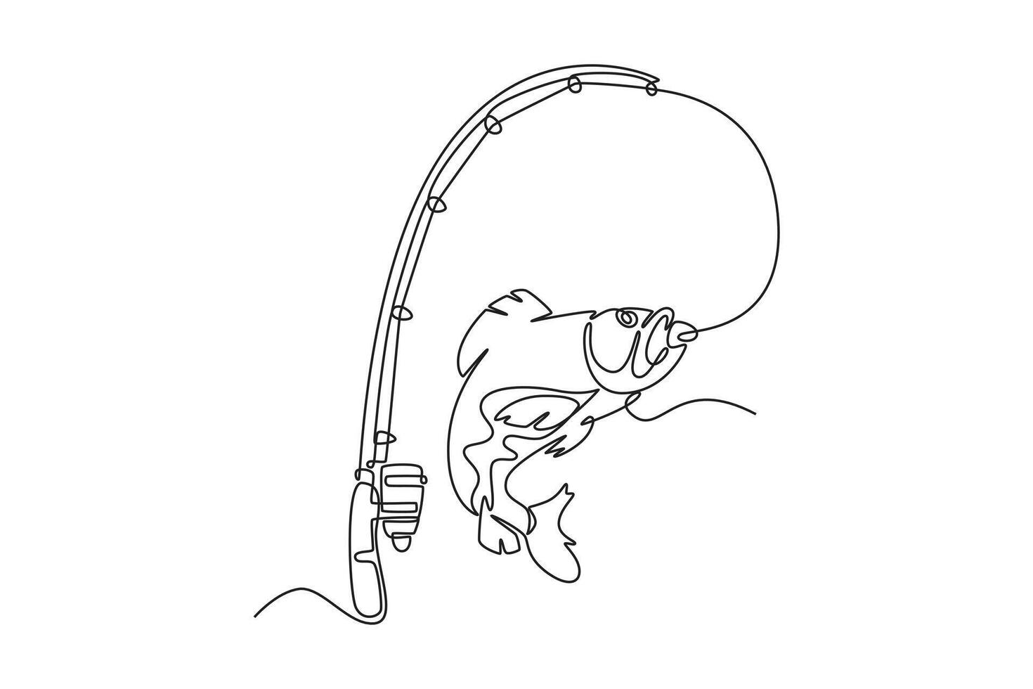 Single one line drawing a big fish is jumping out of water after taking a hook. Symbolizing thrill of fishing, struggle of catch, and successful hunt. Continuous line draw design illustration Pro Vector