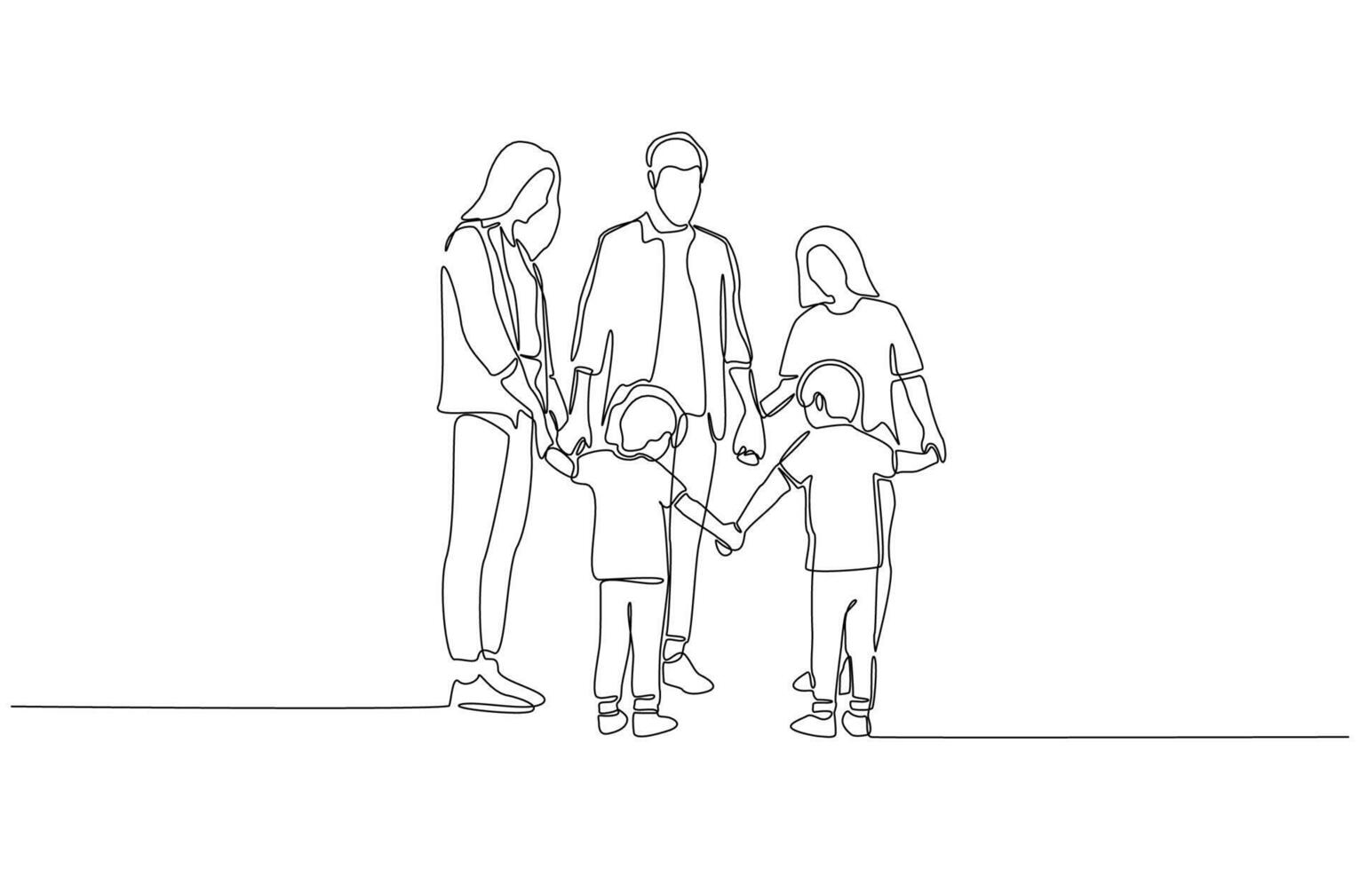 Continuous one line drawing of family holding hands in circle, symbolizing unity, love, connection, and togetherness, single line art Pro Vector