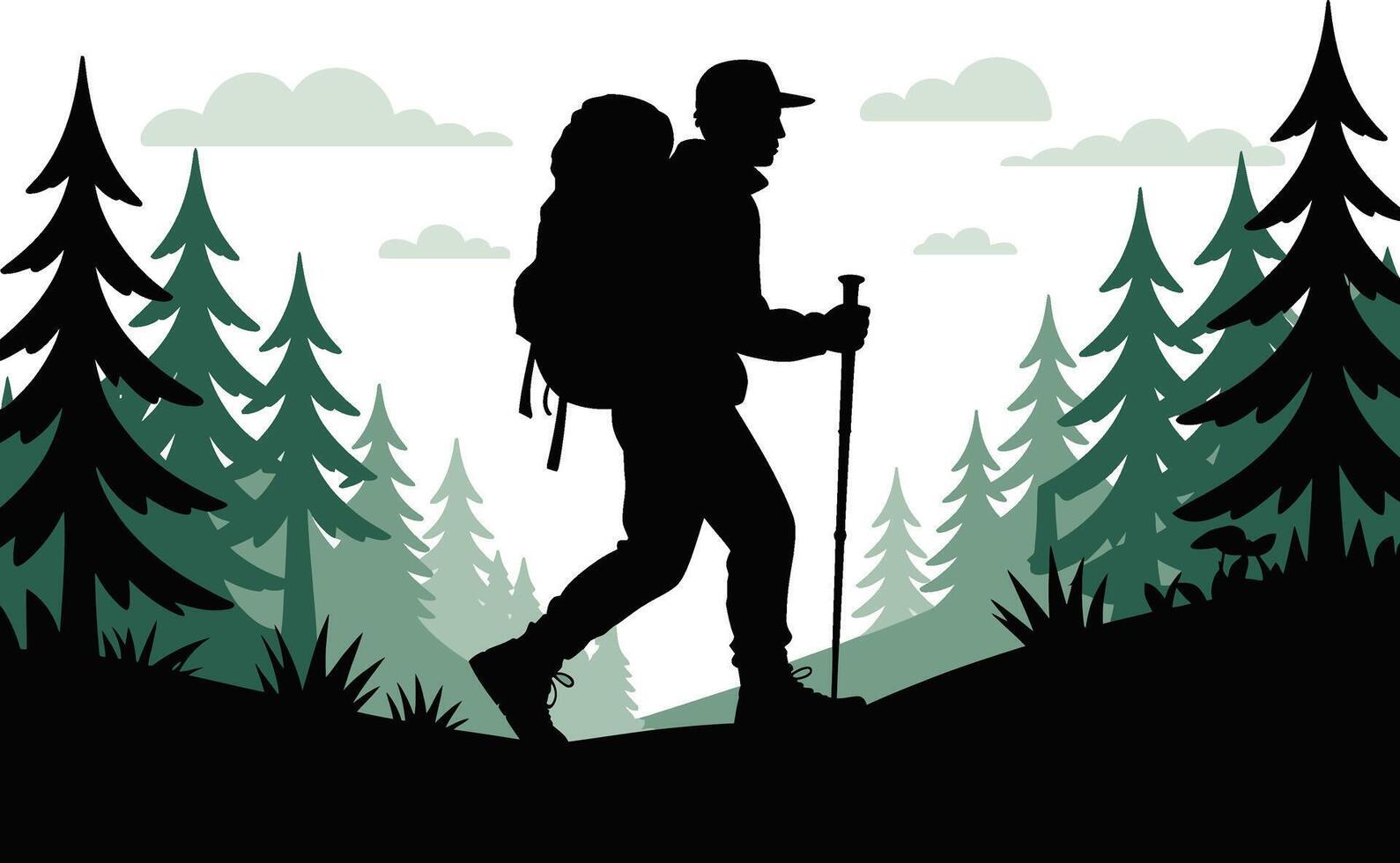 Adventurous hiker with backpack and pole navigating a forest trail silhouette Pro Vector
