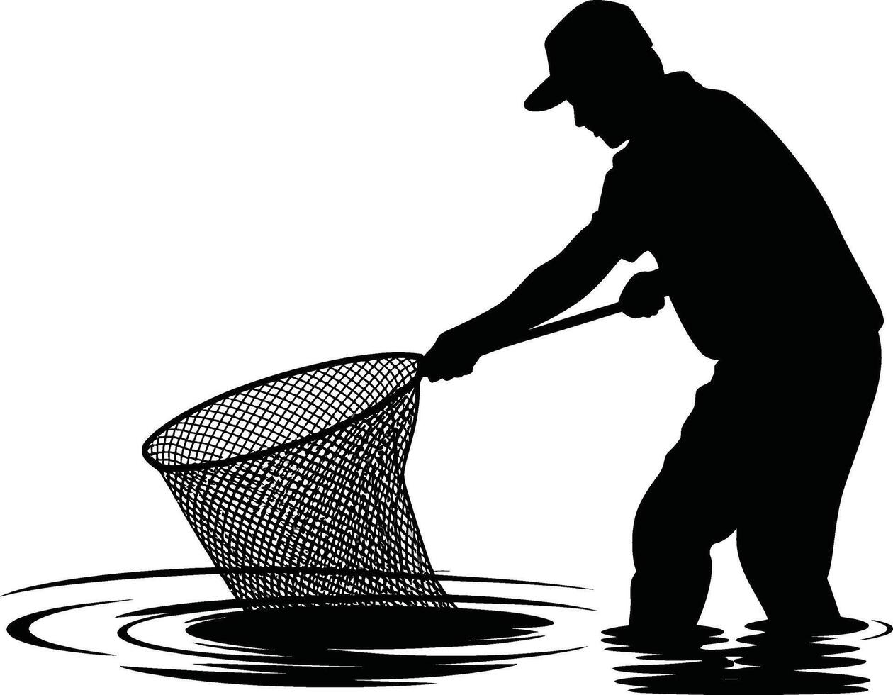 Fisherman in silhouette using a large net to catch fish in shallow water Pro Vector