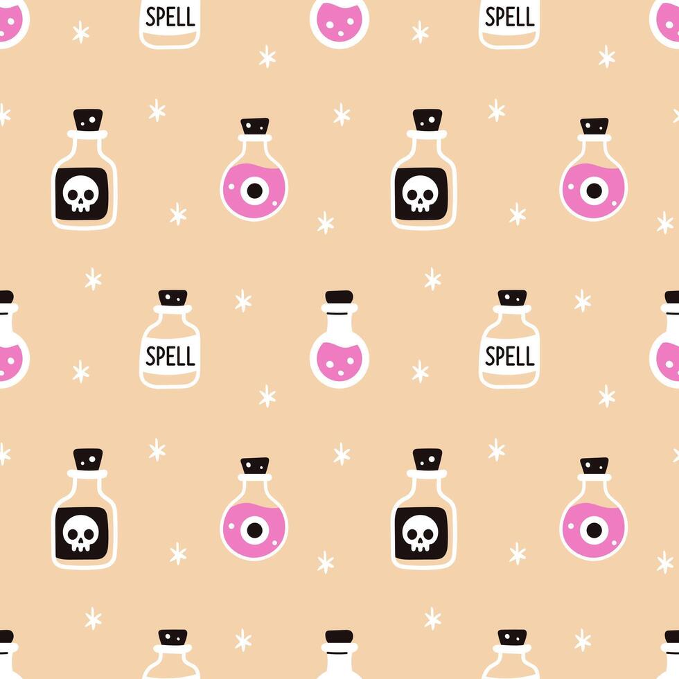 halloween seamless pattern with potion bottles, spell, skull on beige background. Cute print for wrapping and textile design. Magical pattern. Pro Vector