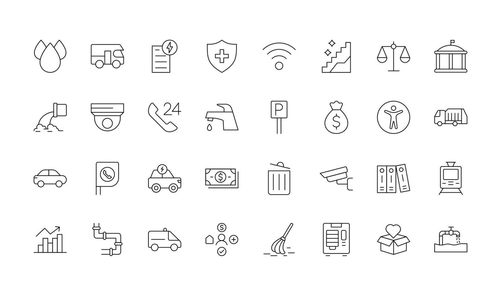 Set of line Public Services icons. Minimalist thin linear web icon set. Line icons related to public utilities, electricity, Gas, water. Pro Vector