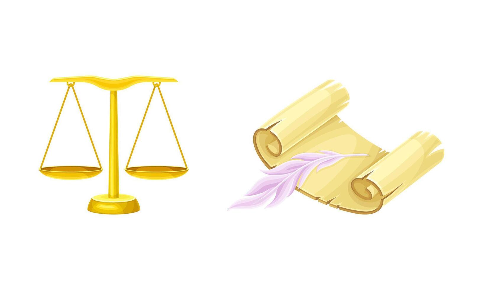 Ancient paper scroll and golden scales. Witchcraft and alchemy objects set cartoon illustration Pro Vector