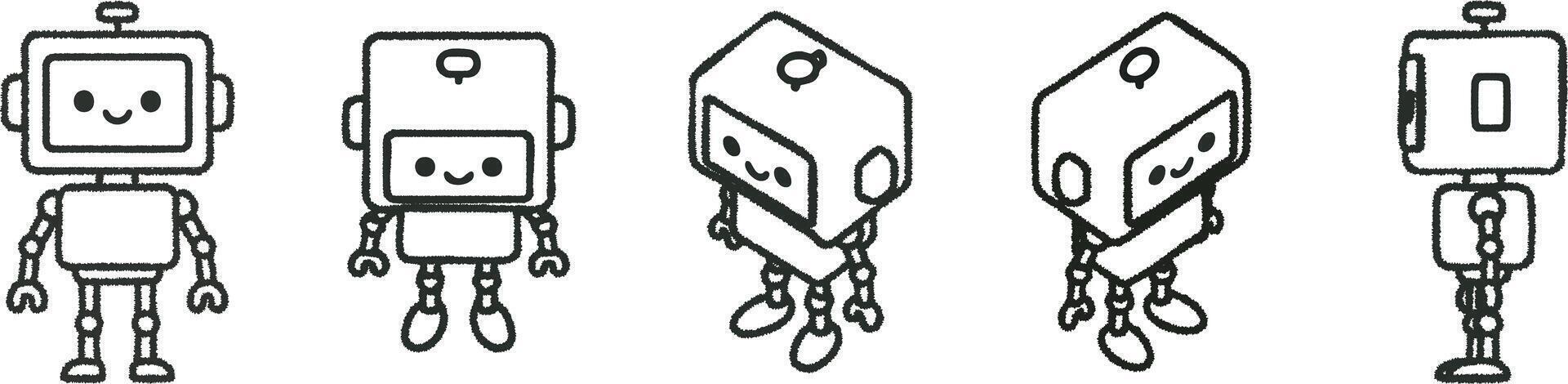 Retro robot characters doodled in a marching row black outline Pro Vector