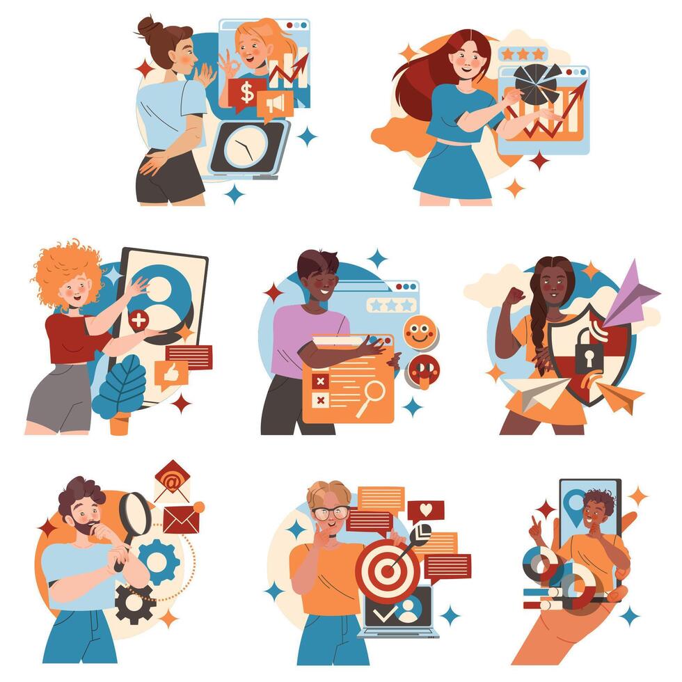 People Character Working with Information Analyzing and Browsing Data Illustration Set Pro Vector