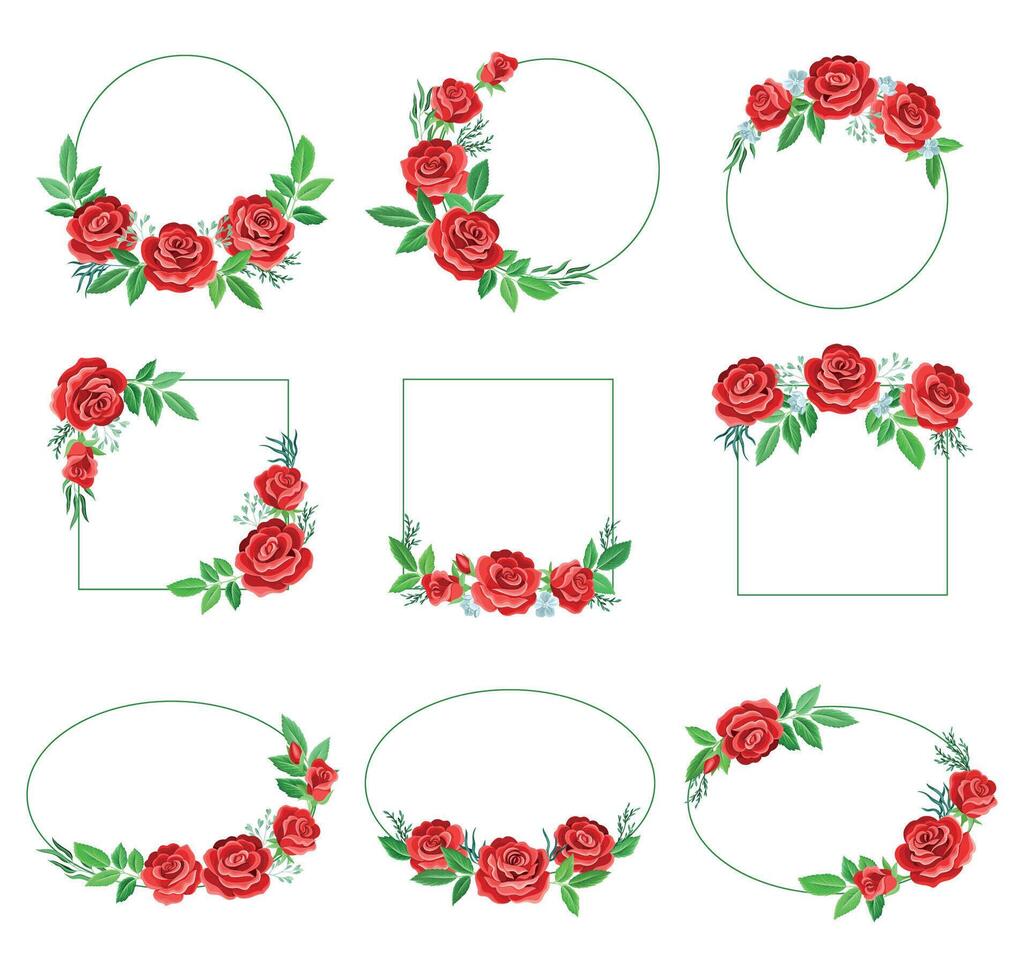 Rose Frame with Red Lush Bud and Green Leaves Arranged in Shape with Border Set Pro Vector