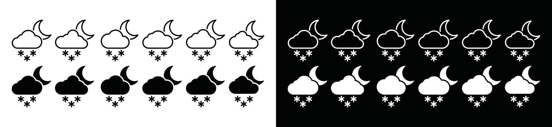 Night weather snowing icon set. Snowflake, moon, and cloud icon. Snowing weather icon collection. Snowfall icons symbol for apps and websites. Illustration Pro Vector