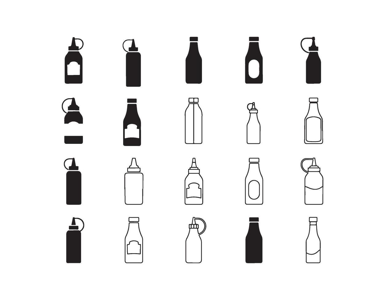 A variety of bottle icons displaying filled, solid, and outline styles, along with different shapes of condiment containers on a clear background Pro Vector