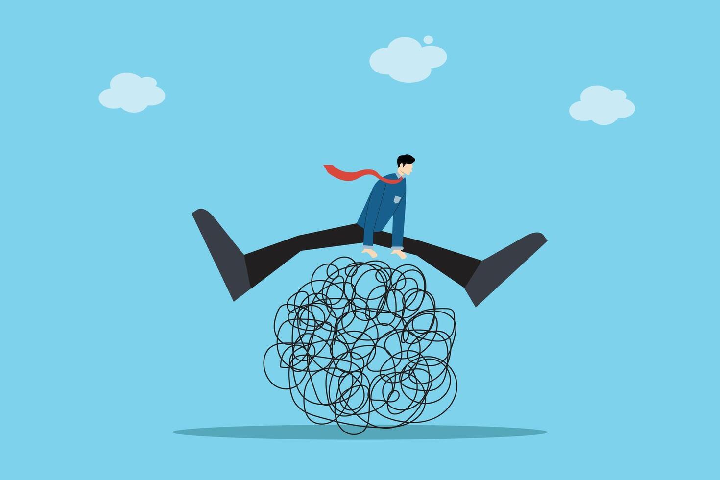 Businessman jumping over tangled lines. Concept of overcoming obstacles, solving problems, resilience, business strategy, and determination for success in challenging situations. Pro Vector