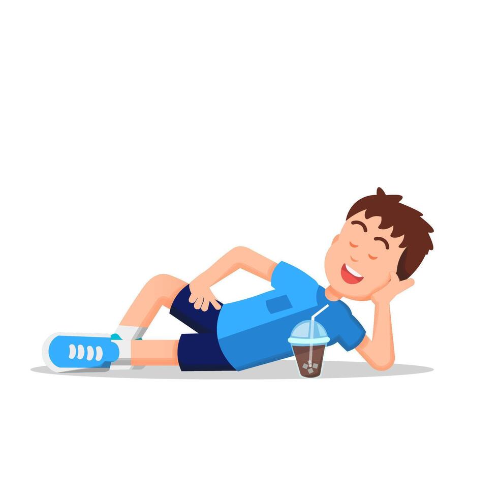 boy relaxing while lying on the floor and having a cold drink in front of him Pro Vector