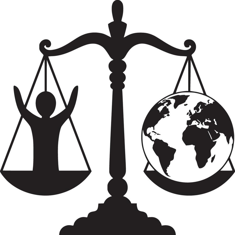 A black and white illustration of a scale with a person and globe on either side in balance Pro Vector