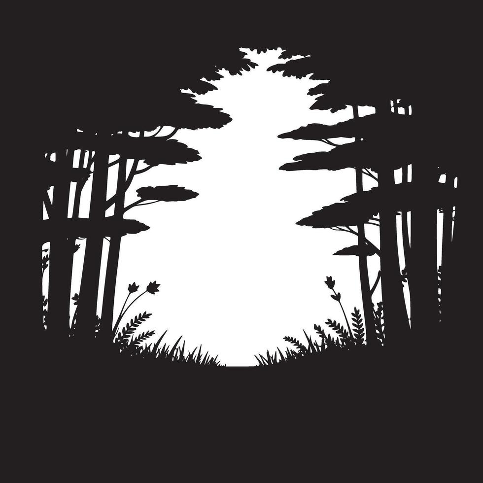 Silhouette of trees and grass creating a frame against a white background in a forest scene Pro Vector