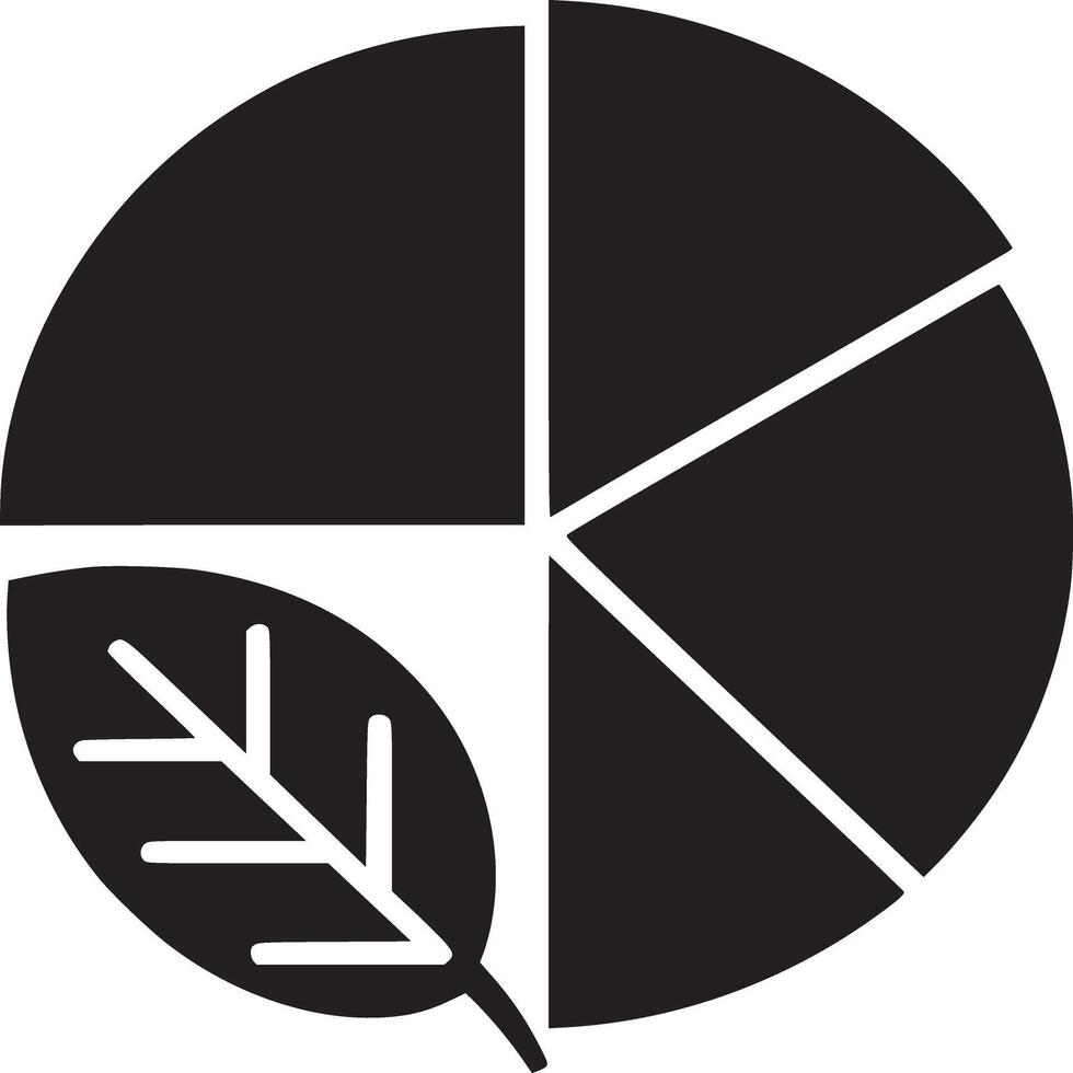 Black and white graphic of a pie chart divided into segments with a leaf on the lower left side Pro Vector