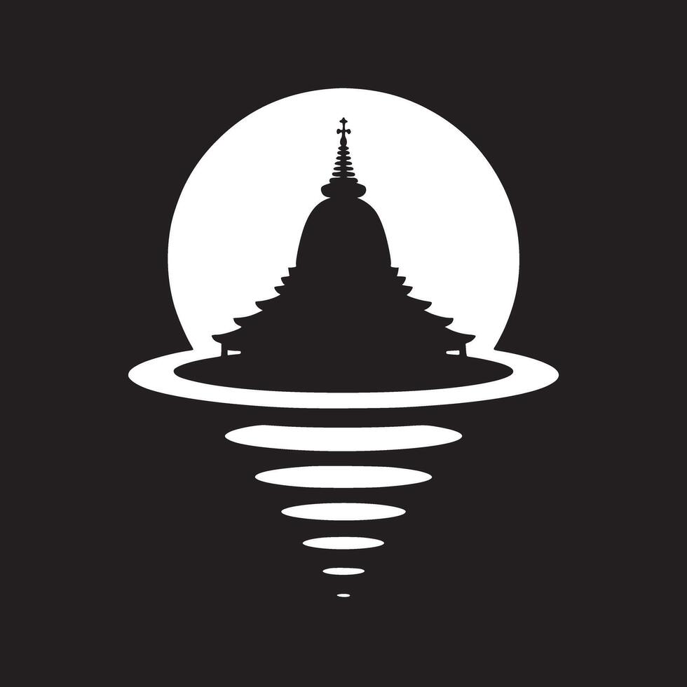 Silhouette of a pagoda with a cross on top in front of a white circle with reflections below it Pro Vector