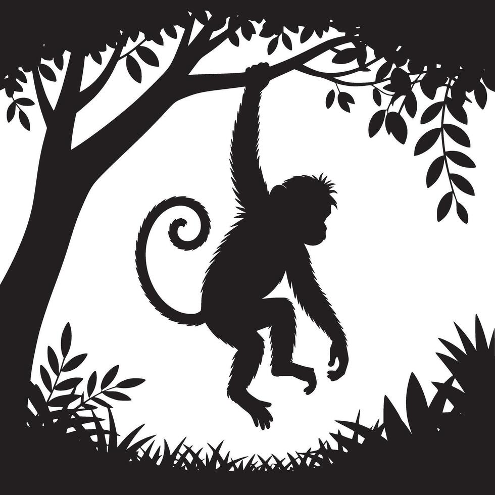 Silhouette of a monkey hanging from a tree branch surrounded by leaves in a black and white image Pro Vector