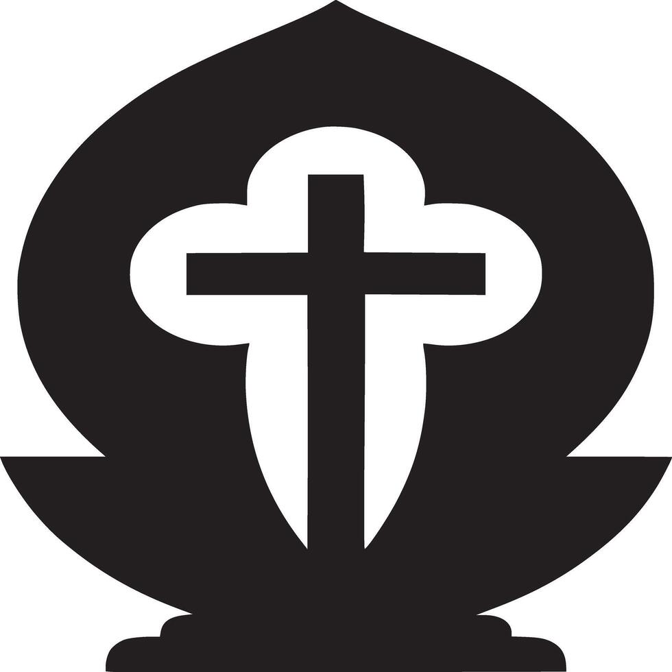 A stylized black and white emblem featuring a cross within a leaf like shape and a small base below it Pro Vector