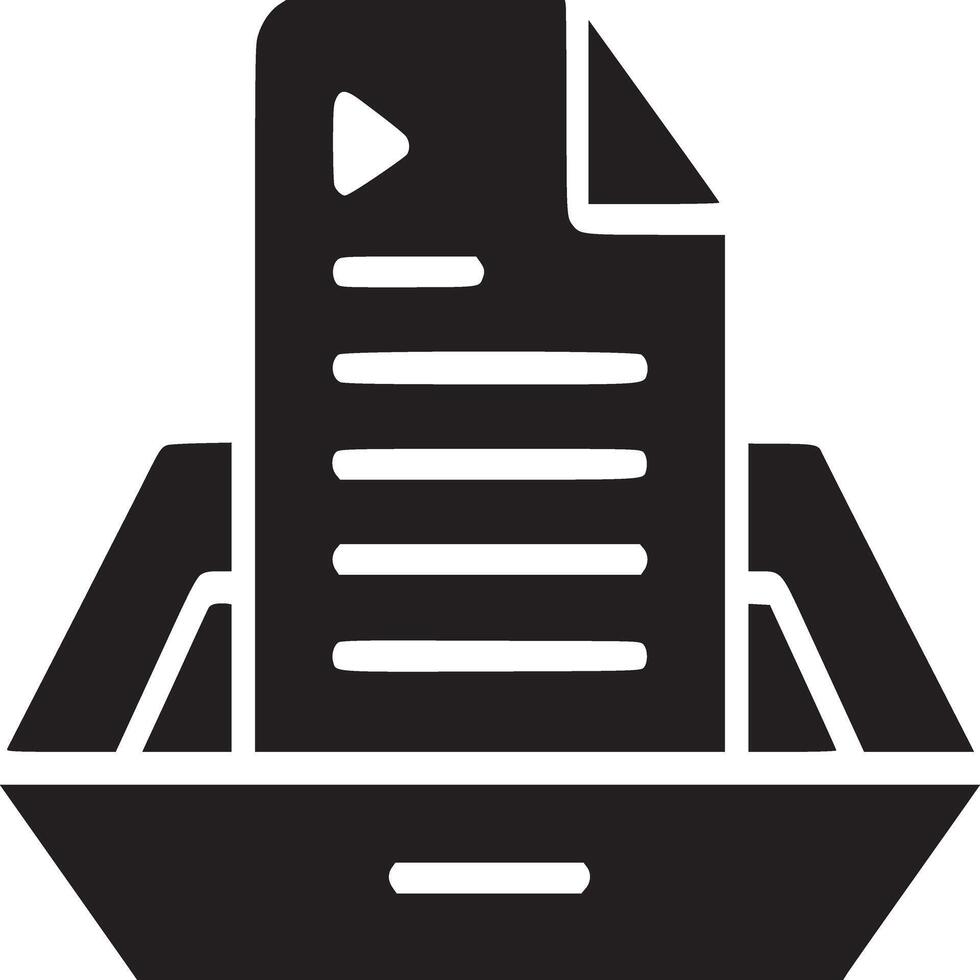 A black and white illustration of a document in a tray with a play button on the page top corner Pro Vector