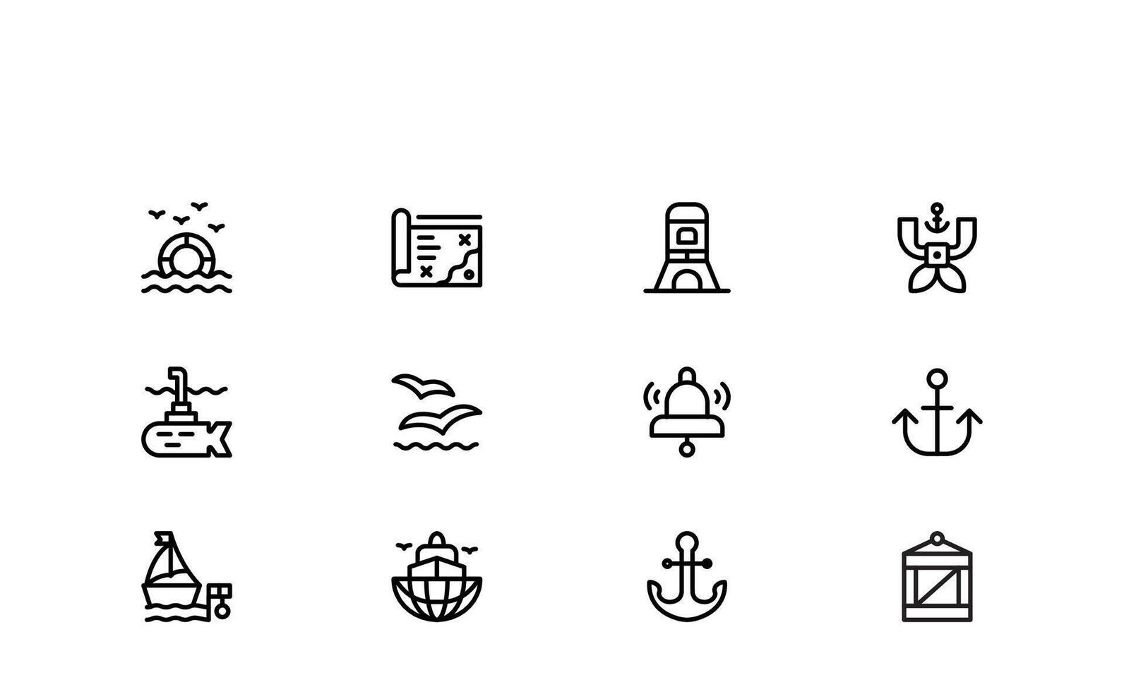 Marine line icon set featuring Minimal marine icon collection in clean outline style with ship, anchor, compass, wave, lighthouse, and sea elements for sailing, navigation Pro Vector