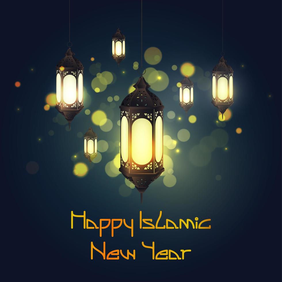 Happy new Hijri year with hanging lantern on bokeh background Pro Vector