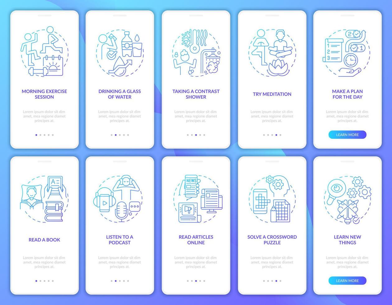 Morning routine blue gradient onboarding mobile app screen set. Wellness walkthrough 5 steps graphic instructions pages with linear concepts. UI, UX, GUI template. Myriad Pro-Bold, Regular fonts used Pro Vector