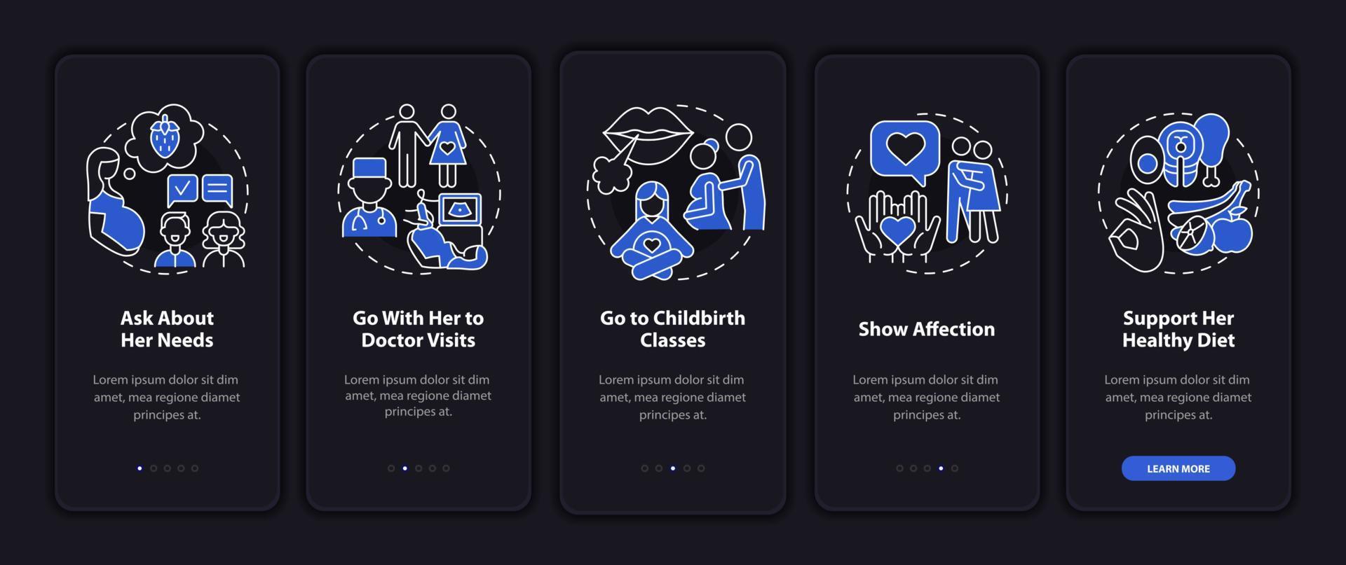 Pregnancy support onboarding mobile app page screen. Care about healthy diet walkthrough 5 steps graphic instructions with concepts. UI, UX, GUI vector template with linear night mode illustrations Pro Vector