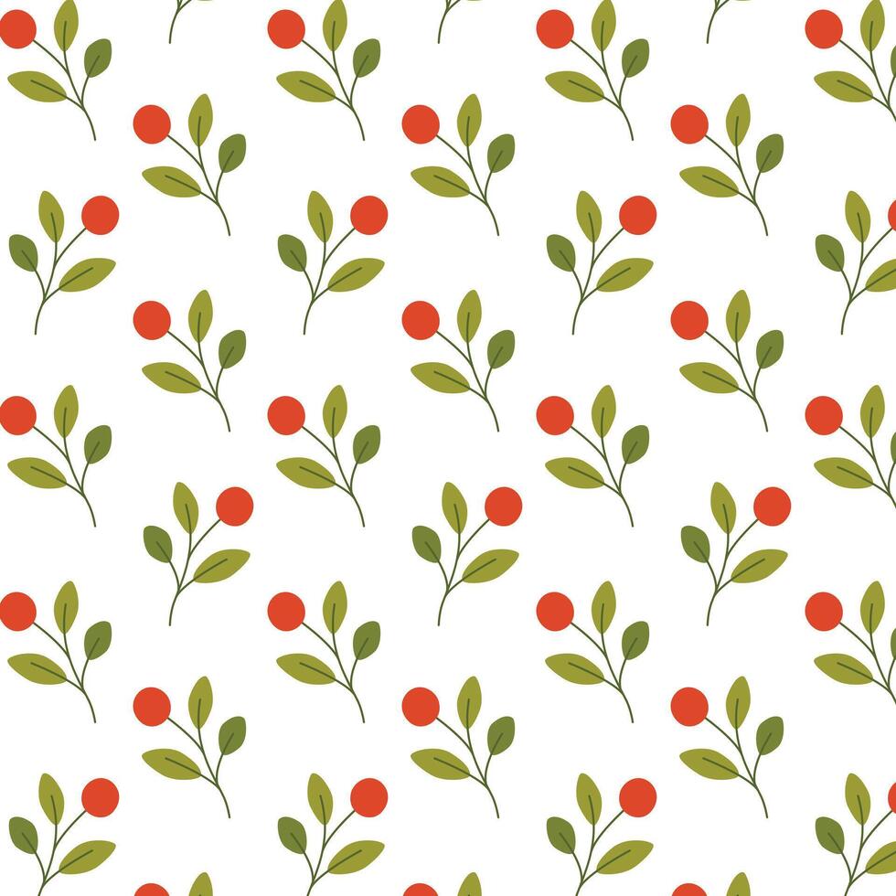 Seamless branch pattern with green leaves and red berries in flat style on white background Pro Vector
