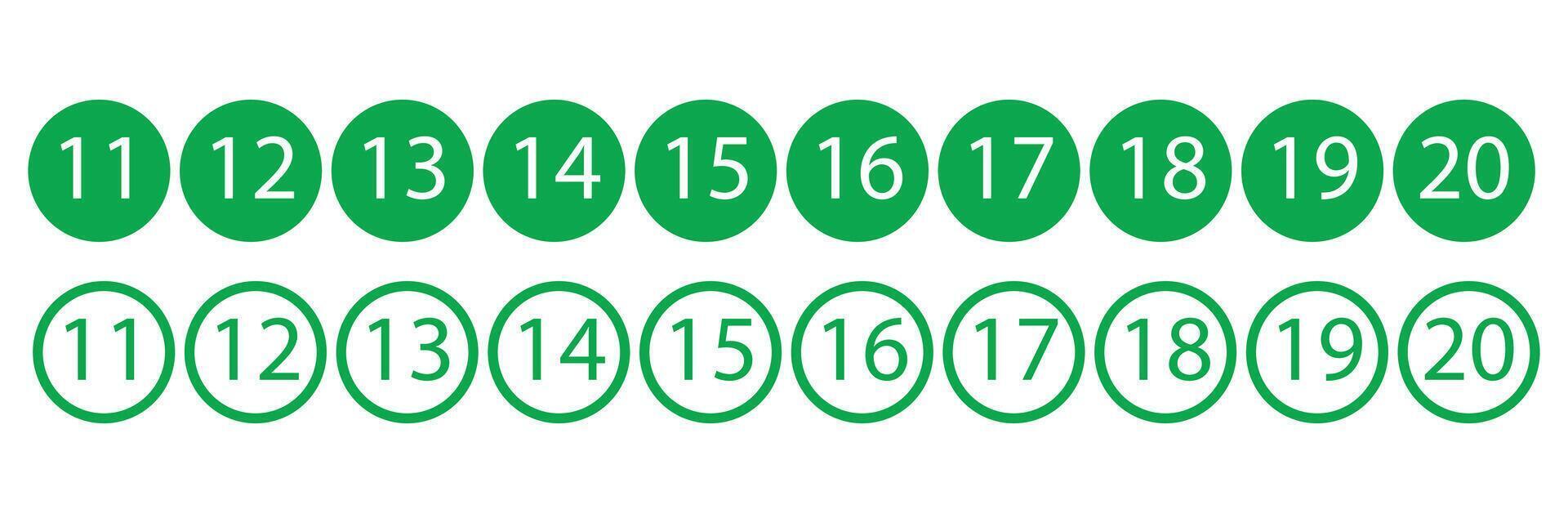 Green numbers from eleven to twenty in circles isolated on white background Pro Vector
