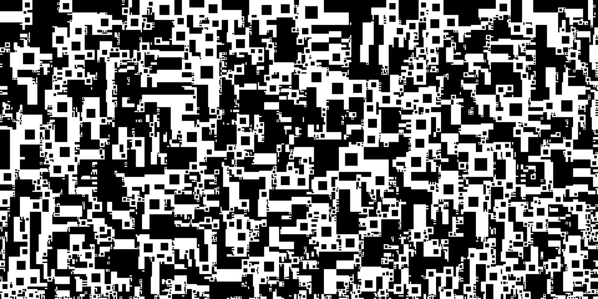 A black and white abstract illustration with a chaotic mosaic of small squares. The background is composed of a glitched pattern with a pixelated appearance. Pro Vector