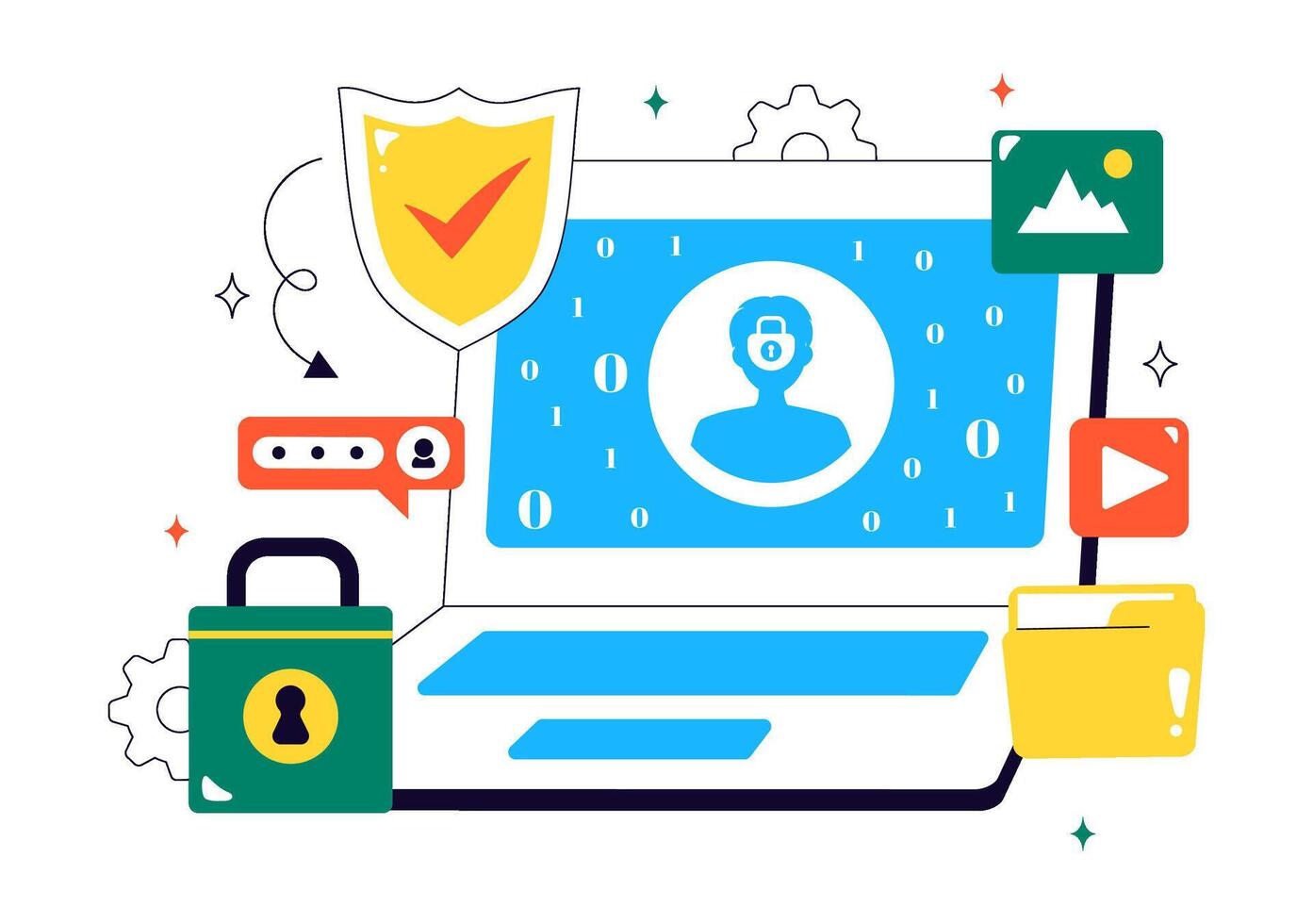 Secure Data Illustration with Computer Screen, Files, and Cybersecurity Lock Symbol Pro Vector