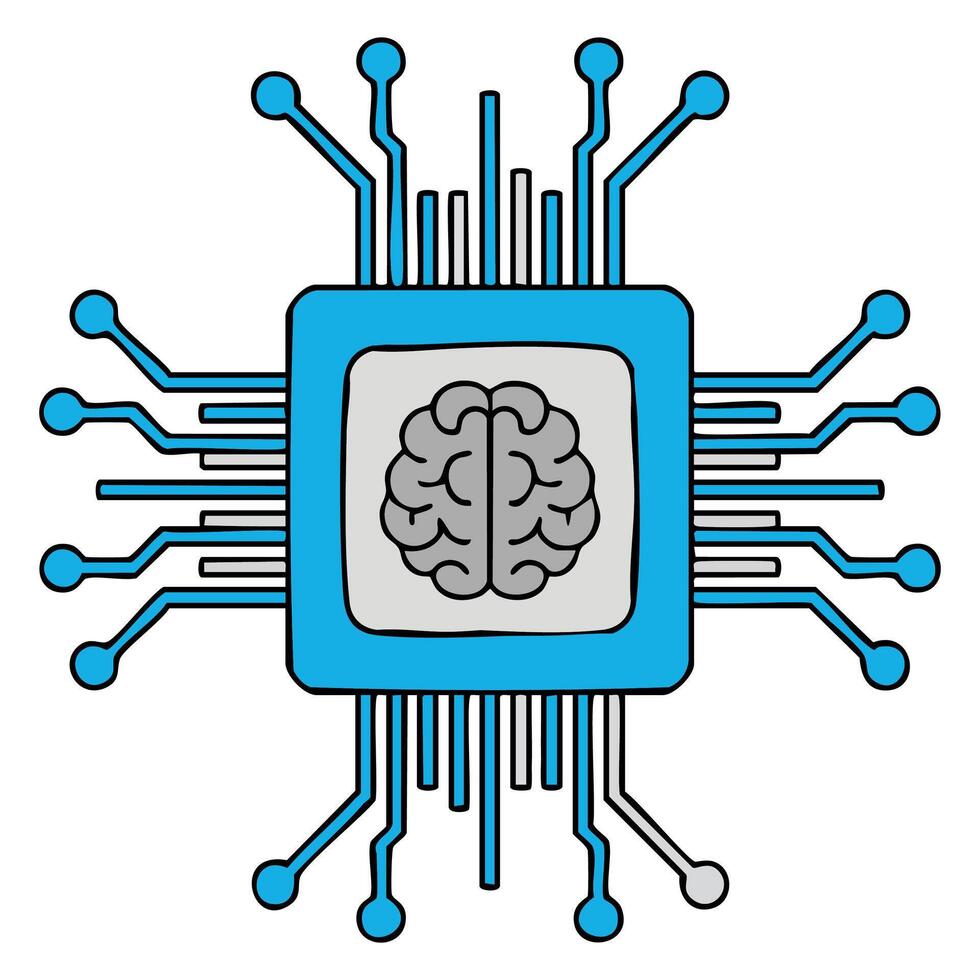 Flat illustration of artificial intelligence processor circuit with brain inside isolated on white background ideal for technology innovation and AI projects Pro Vector
