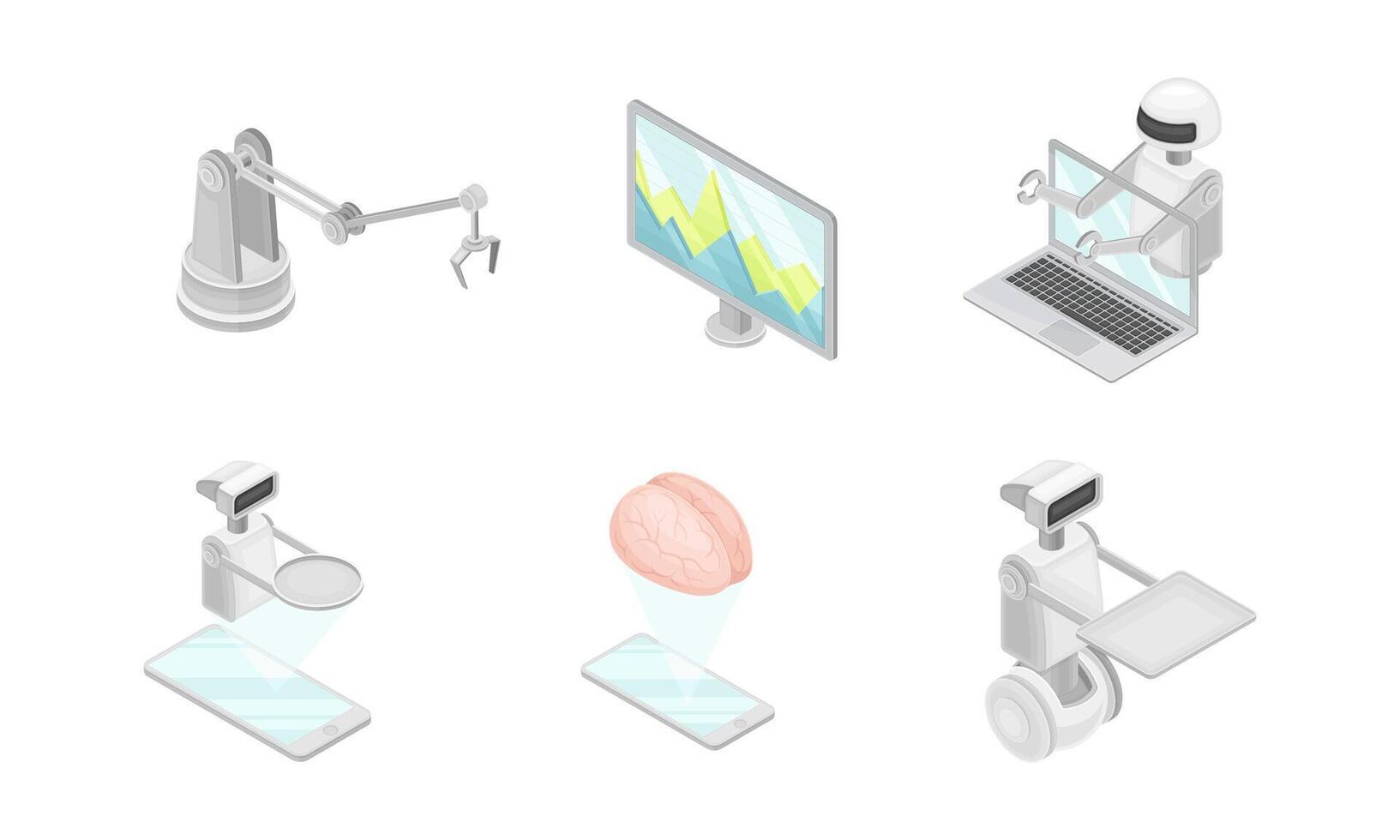 Robotic Technology with Electronic Equipment and Artificial Intelligence Like Smartphone and Automatic Hand Isometric Set Pro Vector