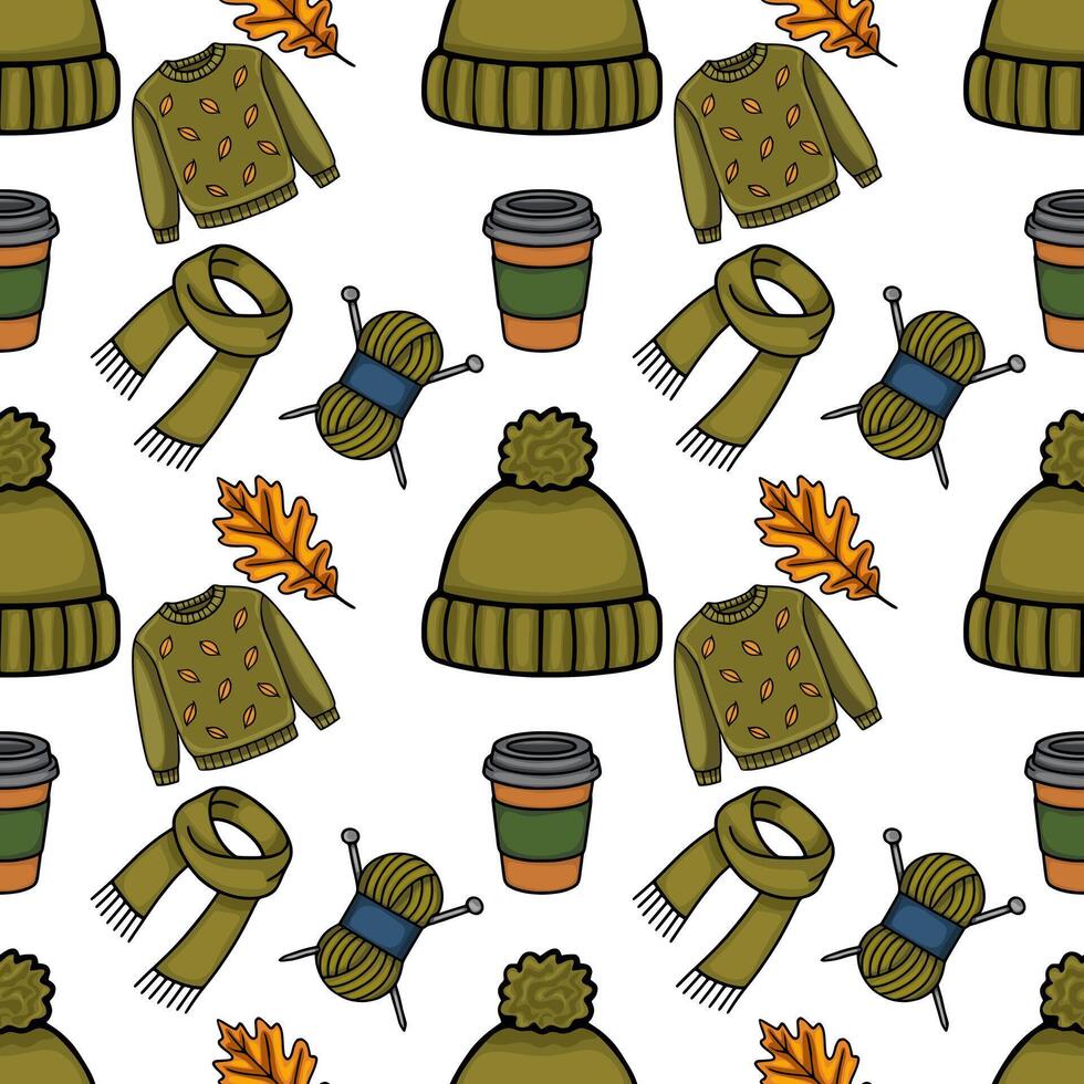 Seamless pattern featuring cozy autumn and winter accessories knitted hats, scarves, sweaters with leaf patterns, yarn with knitting needles, and coffee cups, creating a warm and inviting d... Pro Vector