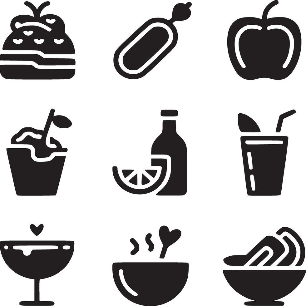 A collection of nine black and white food and drink icons arranged in a three by three grid pattern Pro Vector