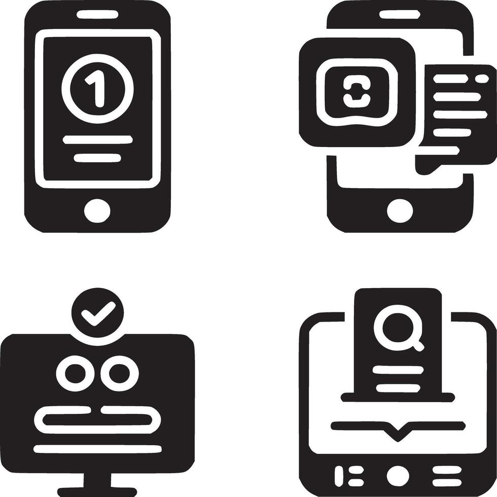 Four black and white icons depicting a phone with notification, a computer, and a tablet display icon vector